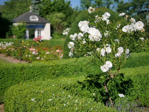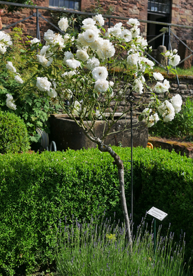 Feld A Beet 12 bepflanzt mit 1 Hochstammrose der Sorte Schneewittchen - Aufgenommen im Rahmen der Inventarisierung und der fotografischen Gesamtaufnahme des Rosengartens im Freilichtmuseum Roscheider Hof, Konz im Juni 2019 Rose Schneewittchen, öfters blühend Rosengruppe: Strauchrosen Im Rosengarten gepflanzt: unbekannt Schneeweiß blühende Rose mit halbgefüllten Blüten. Züchter W. Kordes' Söhne, Markteinführung 1958 Motiv der Aufnahmen: Einzelblüte , Ganze Pflanze, Pflanze mit etwa 1/4 des Rosengartens und des Maretpavillons im Hintergrund
