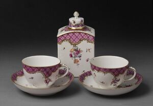 Tassen und Untertassen mit Zwiebelmuster in kobaltblauer Unterglasurmalerei auf weißem Gefäßkörper. Angelehnt an die im 18. Jahrhundert hauptsächlich blau gestalteten ostasiatischen Dekoren, begann die Porzellanmanufaktur in Meißen 1739 mit der Produktion des heute berühmten Meißener "Zwiebelmuster". Das ursprüngliche asiatische Dekor stellte eigentlich keine Zwiebeln dar, sondern Pfirsich, Granatapfel, Chrysantheme und Melone. Marke der Meißner Porzellanmanufaktur an der Unterseite der Tassen und Untertassen.
