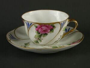 Die Tasse ist weiß mit goldenen Rosen, die sich in einem Oval eines stilisierten, schwarzen Blattkranzes befinden. Jeweils zwischen den Rosen eine senkrechte Leiste die aus mehreren Goldkreisen besteht. Der Lippenrand ist vergoldet und darunter befinden sich ebenfalls goldene Ranken. Der Henkel ist eckig mit Goldumrahmung. Die Tasse ist gedrungen und leicht rechteckig geformt. Die Untertasse mit gleicher Bemalung. Die Tasse ist mit grünem "Krautheim Selb Bavaria" Zeichen versehen. Nach 1884.