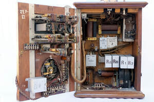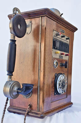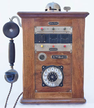 Bis zum Aufbau der Selbstwähltechnik in den Jahren 1920/1930 war der Klappenschrank ZB 13 (Zentralbatterie) Standard für kleine Nebenstellenanlagen mit 1 Amtsleitung und 2 Nebenstellen. Nach der Einführung des Wählberiebes wurden viele ZB (Zentralbatterie) Apparate von der Reichspost auf Selbswählverfahren umgebaut. Ab etwa Mitte der 30er Jahre wurde, nach erfolgtem Umbau, die ursprüngliche Bezeichnung " ZB " in " W " (Wählapparat) geändert. Das abgebildete Exemplar. Es kam -umgebaut- im August 1935 zum 2. Mal in den Einsatz. Auf der Rückseite ist noch die ursprüngliche Kennzeichnung schwach zu sehen. Gut zu erkennen die Amts-, 2 Nebenstellentasten, die Fallklappe für den Amtsanruf, das Schauzeichen für die Nebenstellen, der Drehschalter für interne Gespräche und die Tag/Nacht Umschaltung neben der Klingel.