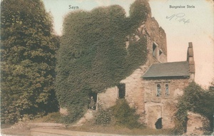 Koloriertes Schwarzweißfoto als Postkarte gedruckt mit der Aufschrift "Sayn. Burgruine Stein" am oberen Bildrand. Diese Aufnahme von 1911 zeigt einen Blick auf die Ruine des Burgmannenhauses der Familie von Stein, die als Verwalter der Sayner Grafen auf dem Kehrberg. Erstmals im 10. Jahrhundert wurden die Grafen von Sayn im Zusammenhang mit dem Pfalzgrafen im Auelgau, dessen Untergrafen sie vermutlich waren, urkundlich erwähnt. Heinrich I. und sein Bruder Eberhard I. von Sayn, die auf der Alten Burg, auch Eselsburg genannt, residierten, sollen zwischen 1139 und 1150 die Grafschaft Bonn durch Heirat erworben haben. Dies führte zu heftigen Auseinandersetzungen mit dem Erzbistum Köln, in deren Verlauf 1152 ihre Burg zumindest teilweise zerstört wurde, sodass sie sich auf die Burg Blankenberg (Sieg) zurückzogen. Mit dem Bau einer neuen Burg auf dem Westsporn des Kehrbergs begann man unmittelbar danach. Graf Heinrich III. (der Große) von Sayn und seine Gemahlin Mechthild von Meißen-Landsberg regierten in der ersten Hälfte des 13. Jahrhunderts von der neuen Burg aus eine sich von der Lahn bis in den Köln-Bonner Raum erstreckende Grafschaft mit Besitzungen an der mittleren Mosel und im Westerwald. Heinrich III. starb 1247 kinderlos. Die Burg Sayn mitsamt Grafschaft fielen an den Grafen Johann I. von Sponheim, den Sohn seiner Schwester Adelheid, dessen Nachfahren sich wiederum Grafen von Sayn nannten. Diese regierten die Grafschaft von ihren Westerwald-Residenzen in Sayn, Hachenburg, Altenkirchen und Friedewald aus. 1345 gelangte durch Einheirat die Grafschaft Wittgenstein ebenfalls zu Sayn. Diese Linie nannte sich dann ab 1361 Sayn-Wittgenstein. 1606 starb Heinrich IV. von Sayn, ohne einen männlichen Nachfolger zu hinterlassen. Die Burg Sayn wurde nur wenige Jahre später 1632 während des Dreißigjährigen Kriegs von den Schweden zerstört. Die nunmehr unbewohnbare Ruine kam 1652 zusammen mit dem Amt Sayn, zu dem die Orte Sayn, Mülhofen und Stromberg gehörten, an das Kurfürstentum Trier, bei dem es bis zum Beginn des 19. Jahrhunderts blieb. Fürst Friedrich Wilhelm von Nassau-Weilburg, der mit der Erbgräfin Luise Isabella von Sayn-Hachenburg verheiratet war, gelangte 1803 in den Besitz der Burgruine, um sie durch die Beschlüsse des Wiener Kongresses 1815 dann als Teil der Rheinprovinz an Preußen abtreten zu müssen. Wieder in den Besitz der Sayner kamen Burgruine und Schloss 1848 durch eine Schenkung des preußischen Königs Friedrich Wilhelm IV. an den soeben mit hohen Auszeichnungen aus Russland zurückgekehrten Fürst Ludwig zu Sayn-Wittgenstein-Berleburg, der das Schloss umgehend neugotisch umbauen ließ, dort einzog und sich fortan zu Sayn-Wittgenstein-Sayn nannte. Die Burg Sayn bestand weiterhin als Ruine, deren Baubestand in den Jahren 1981 bis 1987 unter dem heutigen Besitzer Alexander Fürst zu Sayn-Wittgenstein-Sayn gesichert und teilausgebaut wurde. Heute beherbergt die Burg Sayn das Restaurant "Die Saynburg", welches für Feierlichkeiten und Veranstaltungen gebucht werden kann.