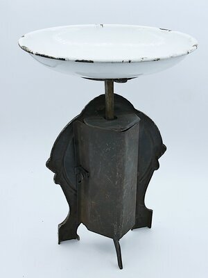 Wirtschaftswaagen sind entweder Federwaagen oder hydraulische Waagen. Die vorliegende Waage ist eine Federwaagen und bestimmt ein Gewicht aufgrund der Verformung einer im Inneren der Waage befindliche Feder. Federwaagen hatten ursprünglich den Nachteil, dass man das Gewicht nur auf 50g genau abwiegen kann und die Feder durch Gebrauch an Spannkraft verliert. Haushaltswaage mit der Aufschrift" Wirtschaftswaage Fabrik Marke S&E" auf dem emaillierten Zifferblatt. Fassung der Waage im linearen Jugendstil. Im unteren Teil des Ziffernblatts befinden sich die Initialen und das Peitschen-Logo der Firma Schmachtenberg & Eickelberg, die unter diesem Namen von 1907 bis 1919 existiert hat. In diesem Zeitraum ist auch diese Waage hergestellt worden. Federwaagen bestimmen ein Gewicht aufgrund der Verformung einer im Inneren der Waage befindliche Feder. Die Waage wiegt bis zu 10 Kilogramm mit einer Genauigkeit von 20 Gramm. Hergestellt wurden diese Art von Waagen von etwa 1880 bis etwa 1930. Zwischen 1880 und 1887 wurden in Deutschland mindestens 7 Patente für Wirtschaftswaagen erteilt. Für eine Suche im depatisnet (der Datenbank des Deutschen Patent- und Markenamts) ist es wichtig hierbei mit der damaligen Schreibweise also "Wirthschaftswaagen" bzw. "Wirthschaftswaage" im Feld Titel zu suchen. (Link zu Depatisnet siehe unter Weblinks). Da die vorliegende Waage keinen Hinweis auf einen Patentschutz trägt (Aufschrift D.P.A. oder D.R.P.A.) kann davon ausgegangen werden, dass sie zu einem Zeitpunkt produziert wurde, an dem der Patentschutz abgelaufen war. https://virtualtour.deutsches-museum.de/navvis/?site=1893603346956088&vlon=4.01&vlat=-0.02&fov=100.0&image=13637
