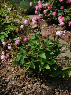 Feld C Beet 3 bepflanzt mit 9 Rosenstöcken der Sorte "Muscosa", auch Moosrose genannt, im Rahmen der Inventarisierung und der fotografische Gesamtaufnahme des Rosengartens im Freilichtmuseum Roscheider Hof, Konz im Juni 2019 Rose mit halbgefüllten intensiv rosa Blüten einmal, aber lang blühend (Juni) Gepflanzt 2015 Rosengruppe: Zentifolien Typ der Aufnahmen: Einzelblüte, einzelne Pflanze