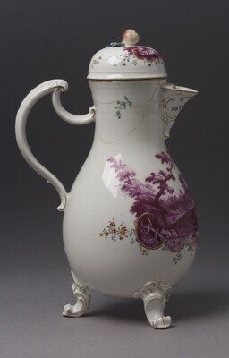 Eine Kaffeekanne auf drei eingerollten Füßen mit Rocaillenverzierung. Der Gefäßkörper ist bauchig, mit einem stark eingezogenen Hals und einer breiten Schnauze. Der Henkel ist stark durchgebogen. Das Bildmotiv ist eine purpurfarbene Landschaft, die nach unten mit gelben Rocailleranken und Streublumen abgeschlossen wird. Im Vordergrund sitzt ein sich ausruhender Mann und vor ihm steht eine Frau mit Kind. Dahinter befindet sich ein Gehöft, von links ragt ein Baum ins Bild hinein, rechts ist ein Fluss. Weit im Hintergrund sind Berge. Der Knauf des Deckels ist in Form einer gelb-roten Birne mit grünen Blättern. Eine kleinere Bildszene, ähnlich gestaltet wie die auf dem Gefäßkörper, ist auf den Deckel gemalt. Die Schnauze ist Gold umrandet und mit kleinen Blümchen verziert. Streublumen sind über die Kanne verteilt aufgemalt.