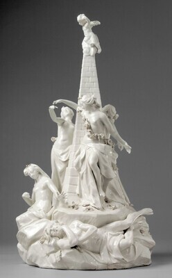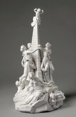 Sieg der Schönheit über den Neid°, allegorische Pyramidengruppe von Konrad Linck. Die "Schönheit", wird versinnbildlicht durch ein Mädchen, das auf einem Felssockel sitzt und in den Spiegel blickt. Der "Neid" windet sich in Gestalt eines Mannes am Boden. Um die titelgebenden Figuren tanzen drei Grazien - Aglaia, Euphrosyne und Thalia einen Girlandenreigen um einen emporragenden Obelisken, einem Symbol der Ewigkeit. Auf der Spitze des Obelisken sitzt ein Putto als Symbol des Sieges. Die Putten auf der Rückseite umarmen und küssen sich. Sie sind der Schönheit zugeordnet (Schönheit durch Liebe geboren besiegt den Neid - siehe Werhahn). Im Fuß innen zylindrisches Verstärkungsstück. Blaumarke "CT"_ "79". Erhaltungszustand: Brandrisse; vielfältige Fehlstellen; Ergänzungen: Flügel des Puttos an der Spitze, fast alle Arme und Hände, große Teile des Sockels