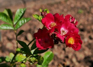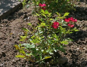 Feld D 8 - bepflanzt mit 9 Rosenstöcken der Sorte "Mozart", im Rahmen der Inventarisierung und der fotografische Gesamtaufnahme des Rosengartens im Freilichtmuseum Roscheider Hof, Konz im Juni 2019 Rosensorte: Mozart, dem Komponisten "Wolfgang Amadeus Mozart" gewidmet Rose mit nicht gefüllten kaminroten Blüten mit weißer Mitte öfter blühend Markteinführung 1937 Gepflanzt ???? Rosengruppe: Wildrosen Züchter: Peter Lambert Foto: einzelne Pflanze, Einzelblüte mit Knospe