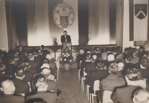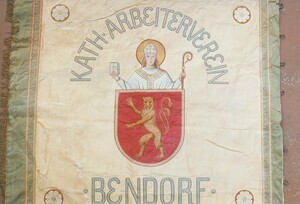 Farbfotografie. Diese Aufnahme zeigt die Fahne des Handwerker- und Arbeitervereins Bendorf aus dem Jahre 1881. In einem Medaillon in der Mitte der Fahne ist der Stadtheilige Medardus mit Bischofsstab und dahinter die Medarduskirche von Bendorf dargestellt. Foto: Michael Syré, 1990