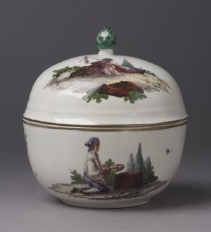 Flacher kleiner Teller. Im Spiegel die Stadtansicht von Mannheim mit dem Blick auf Jesuitenkirche, dabei Sternwarte, von Zollhaus und Rheinbrücke aus. Rand mit Blumenkranz und abschließendem Rautenband.