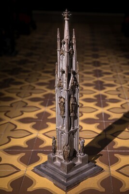 Blei; Modell; Rundplastische verkleinerte Nachbildung des Hochkreuzes als Bleimodell, gefertigt in der Sayner Hütte. Abgüsse dieses Modells sind uns bisher nicht bekannt. Anlässlich des vermuteten 500-jährigen Jubiläums des mittelalterlichen Hochkreuzes bei Godesberg (1333), brachte die Sayner Hütte im Jahre 1833 außerdem eine Neujahrsplakette heraus. Hierzu hatte der Architekt Bernhard Hundshagen seine Entwürfe bereits im Jahre 1824 eingereicht. 1832 wurde dieses Motiv erst für das Neujahr 1833 ausgewählt (Zeichnung: Bernhard Hundshagen; Modell: Heinrich Zumpft).