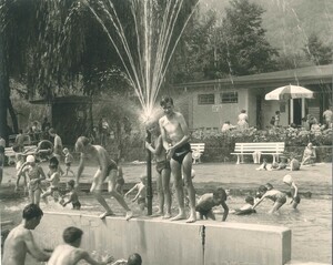 Schwarzweißfotografie. Diese Aufnahme entstand im Jahr 1981 und zeigt das noch heute bestehende Freibad "Bad Sayn", gelegen im Sayntal in Bendorf-Sayn.