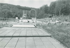 Schwarzweißfotografie. Diese Aufnahme entstand während der Zeit des Nationalsozialismus im Jahr 1931 und zeigt das noch heute bestehende Freibad "Bad Sayn", gelegen im Sayntal in Bendorf-Sayn. Zu erkennen ist rechts das Nichtschwimmer- und links dahinter das Schwimmer-Becken mit Badegästen.