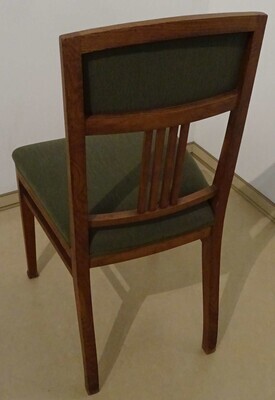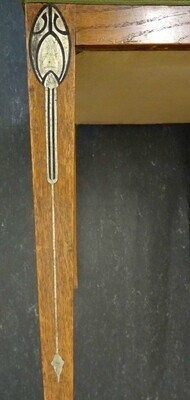 Material: Eichenholz furniert, Blindholz Buche, Säulen und Füße Eichenholz, schwarz gebeizt. Einlegearbeiten: Zinn, Eiche furniert und schwarz gebeizt. Beschläge: Kupfer patiniert (Originalzustand). Dauerleihgabe. Stühle aus Eichenholz mit grünem Polster (neu bezogen) an Rückenlehne und Sitz. Die Stuhlbeine weisen Verzierungen mit langstieligen Blütenknospen im Jugendstil auf.