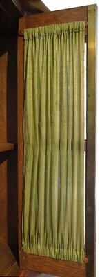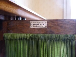 Material: Eichenholz furniert, Blindholz Buche, Säulen und Füße Eichenholz, schwarz gebeizt. Einlegearbeiten: Zinn, Eiche furniert und schwarz gebeizt. Beschläge: Kupfer patiniert, Scheibengardinen aus Seide (Originalzustand). Dauerleihgabe. Unterteil mit zwei verzierten Holztüren, Oberteil mit drei Klapptüren, teilverglast. Scheibengardinen aus hellgrüner Seide, mit vier schwarzen ebonisierten Säulen, drei Schubladen im Mittelteil. Schubladenbeschläge kupferpatiniert. Auf der Innenseite des rechten Flügels der mittleren Tür im Oberteil steht auf einer Plakette : „Hofmöbelfabrik A. Bembé, Mainz. Gegründet 1780 “. Bembé bezog sich hierbei auf das Tapezier-Geschäft mit Polsterei, Verkauf von Dekorationsartikeln und Möbel-Handlung von Johann Benedikt Bembé, Anton Bembés Großvater, in Mainz. Hier wurden allerdings noch keine Möbel hergestellt. Anton Bembé gründete 1825 einen neuen Möbelbetrieb in der Vorderen Präsenzgasse 3 und übernahm später die Werkstätten seiner Eltern. Das Unternehmen wollte sich mit dieser Plakette als traditionsreicher Lieferant des Adels darstellen.