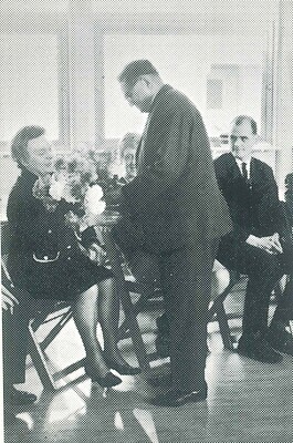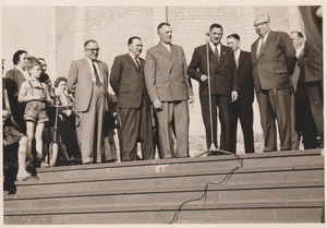 Schwarzweißfotografie. Diese Aufnahme aus dem Jahr 1965 zeigt den damaligen Bürgermeister Georg Bauer während der Feierlichkeiten zur Einweihung eines neuen Schulpavillons der Bodelschwingh Grundschule am Röttchenshammer in Bendorf-Mülhofen. Georg Bauer war Bürgermeister der Stadt Bendorf von 1949 bis 1967.
