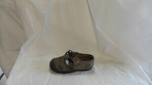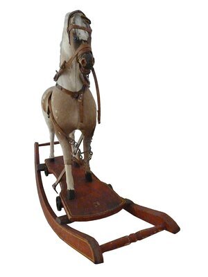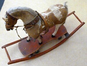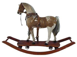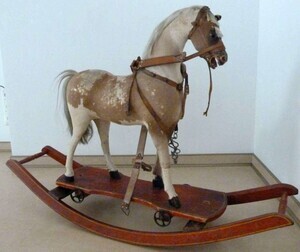 Fell des Pferdes braun - weiß gescheckt, hellgrauer Schwanz, Zaumzeug aus braunem Leder, Standbrett aus braunem Holz mit 4 Rollen, Schaukelvorrichtung aus braunem Holz mit 2 Querverstrebungen, Pferd kann als Zieh- und Schaukelpferd genutzt werden.