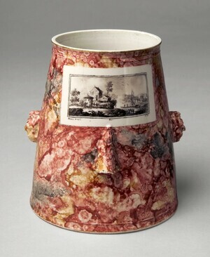 Rechaud, mit marmorähnlicher Bemalung und zwei Landschaften in Schwarzlotmalerei. Das Rechaud ist rund und verjüngt sich von unten nach oben. Auf der Wandung zwei plastische Maskarons und volutenförmige Öffnungen. CT- Marke mit Kurhut.