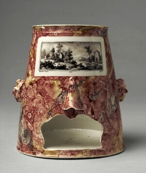 Rechaud, mit marmorähnlicher Bemalung und zwei Landschaften in Schwarzlotmalerei. Das Rechaud ist rund und verjüngt sich von unten nach oben. Auf der Wandung zwei plastische Maskarons und volutenförmige Öffnungen. CT- Marke mit Kurhut.