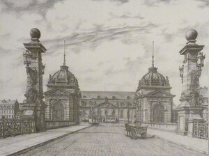 Das Bild zeigt die beiden Brückenhäuser auf der Mainzer Seite der Rheinbrücke (heute Theodor-Heuss-Brücke) mit Straßenbahn und Pferdefuhrwerk. Seriennummer 278/480. Künstler: Poller (?), um 1900