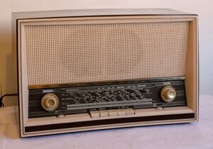 Der Saba "Triberg 125" wurde in den Jahren 1960-1962 in Villingen gebaut. Auf der Fronseite gibt es 5 Drucktasten für Ein/Aus, LW, MW, UKW sowie einer Taste für die Sprachverbesserung. Für einen angenehmen Klang sorgt ein großer, ovaler Lautsprecher. Auf der Rückseite sind Anschlüsse für Phono, Tonband und externe Lautsprecher vorgesehen. Bei unserem Gerät liegt im Innern noch die Röhrengarantiekarte, ein Schaltplan und eine Abgleichanleitung,