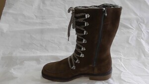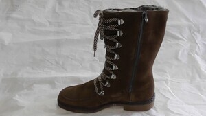 Ein einzelner Damenstiefel aus braunem Veloursleder. Eckige Form, Absatz (ca. 1,5cm). Der Schuh verfügt über einen Reißverschluss und eine Zierschnürung. Hergestellt von der Firma Salamander in Kornwestheim (D). Datiert auf 1971.