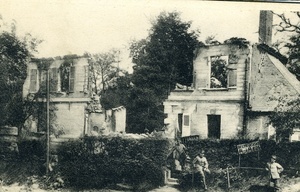 Schwarzweißfotografie. Diese Aufnahme zeigt das ehemalige Wohnhaus der Familien Ramroth und Freisberg an der Hauptstraße (heute Westerwaldstraße) in Bendorf-Stromberg. Das Haus diente wohl als Poststelle (Schild über dem Eingang). Vor dem Gebäude haben sich Bewohner mit einem Pferd aufgestellt. Rechts im Vordergrund ist ein Fuhrwerk bzw. Karren abgestellt. Ein weiteres Schild am Haus zeigt die Aufschrift "Nach Sayn" mit Pfeil in die entsprechende Richtung (vergleiche 7.3109).