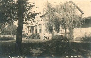Schwarzweißfotografie als Postkarte gedruckt und mit der Aufschrift "Bendorf-Rhein / Schützenhöhe." am unteren Bildrand versehen. Diese Postkarte aus dem Jahr 1955 zeigt eine Ansicht des Restaurants "Schützenhöhe" auf der Vierwindenhöhe in Bendorf von vorne mit dem Eingangsbereich. Inhaber war Toni Geissler, Vater der heutigen Seniorchefin Elfriede Helling. Der Hotel- und Gastronomiebetrieb wird heute von den Brüdern Markus und Michael Helling unter der Bezeichnung "Berghotel Rheinblick" geführt. Damals waren die Schießanlagen des Bendorfer Schützenvereins unmittelbar neben der Gaststätte zu finden. Die "Bendorfer Schützengesellschaft 1844" hat schließlich an der Brauereistraße in Bendorf ein neues Schützenhaus gebaut. Vergleiche Inv.-Nr. 7.0732: Innenaufnahme des Restaurants "Schützenhöhe".