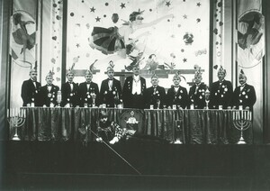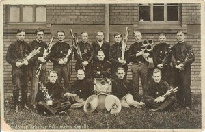 Schwarzweißfotografie als Postkarte gedruckt und mit der Aufschrift "Bendorfer Arbeiter Schalmeien-Kapelle" am unteren Bildrand versehen. Diese Aufnahme zeigt die kommunistische Bendorfer Arbeiter Schalmeien-Kapelle im Jahr 1931. Von links nach rechts stehend: P. Dötsch, J. Schneider, T. Book, P. Löhr, W. Eudenbach, F. Sauerborn, M. Thon, H. Stoffel, J. Lorum; sitzend: F. Decker, A. Decker, S. Pfaffenhausen, H. Mentowski, A. Sauerborn.
