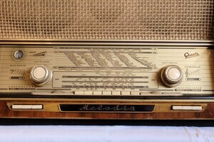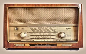 Ein großes, formschönes Radiogerät, das dem allgemeinen Zeitgeist entsprach. Von Graetz in den Jahren 1957/1958 gebaute Modell "Melodia" wurde speziell mit dem Hinweis "Raumklang Grosssuper mit Schallkompessor" beworben. Dahinter verbirgt sich ein Druckkammersystem mit Klangrohrstahlern. Laut Prospekt soll diese Kontruktion für eine besorners gute Klangwiedergabe sorgen. Mit den Drehreglern, beiderseits der Senderskala, werden die Lautstärke, bzw. die Sender gewählt. Über insgesamt 7 Drucktasten können die Wellenbereiche MW/LW/KW/UKW, Ein/Aus, Plattenspieler und Tonband angesteuert werden. Unterhalb der Senderskala, beiderseits des Schriftzuges "Melodia", gibt es weitere Drucktasten, womit der Raumklang, die Lautsprecher, und das Magische Auge Ein- und Ausgeschaltet werden können. Rückseitig sind Anschlüsse für Tonabnehmer, Tonband und ext, Lautsprecher vorhanden. Der Ladenpreis lag 1957 bei fast 400 DM.