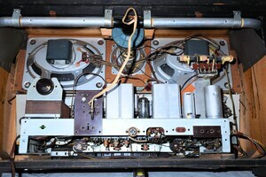 Ein großes, formschönes Radiogerät, das dem allgemeinen Zeitgeist entsprach. Von Graetz in den Jahren 1957/1958 gebaute Modell "Melodia" wurde speziell mit dem Hinweis "Raumklang Grosssuper mit Schallkompessor" beworben. Dahinter verbirgt sich ein Druckkammersystem mit Klangrohrstahlern. Laut Prospekt soll diese Kontruktion für eine besorners gute Klangwiedergabe sorgen. Mit den Drehreglern, beiderseits der Senderskala, werden die Lautstärke, bzw. die Sender gewählt. Über insgesamt 7 Drucktasten können die Wellenbereiche MW/LW/KW/UKW, Ein/Aus, Plattenspieler und Tonband angesteuert werden. Unterhalb der Senderskala, beiderseits des Schriftzuges "Melodia", gibt es weitere Drucktasten, womit der Raumklang, die Lautsprecher, und das Magische Auge Ein- und Ausgeschaltet werden können. Rückseitig sind Anschlüsse für Tonabnehmer, Tonband und ext, Lautsprecher vorhanden. Der Ladenpreis lag 1957 bei fast 400 DM.