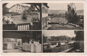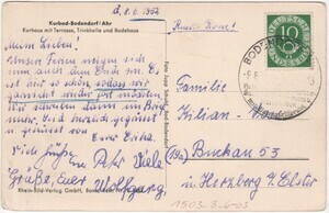 Karte im Querformat und Schwarz-weiß-Druck Gezeigt werden vier Motive. Oben links Kurhaus vom Kurmittelhaus her fotografiert, daneben rechts die Terrasse des Kurmittelhauses. Unten links Blick auf Durchgang vom Kurpark zum Kurhaus mit dem Abscheidetank der Kohlensäureverflüssigungsanlage (Kohlensäure-Werk), daneben rechts Blick von der Kurhausterrasse auf das Kurmittelhaus, rechts, und Kohlensäure-Werk, links. Die Karte ist rückseitig beschriftet und wurde nach Buckau in der russischen Besatzungszone verschickt.