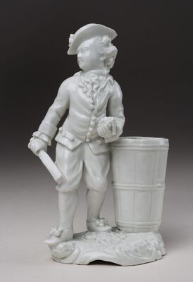 Die Kleidung des Kavaliers ist weiß, mit bunten Details wie roten und blauen Streifen auf der Kniebundhose. Die Säume seiner Jacke sind mit blau abgesetzt. Um den Hals trägt er eine schwarze Schleife gebunden. Seine Schnallenschuhe sind schwarz, die Schnalle gold. In der linken Hand hält er einen Hut in dem zwei Vögelchen sitzen, mit der rechten Hand zeigt er auf diesen. Er steht auf einem Sockel mit goldfarbenen Rocaillen.