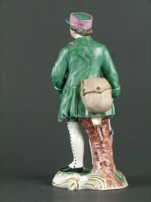 Figur eines Jägers. Er steht, in der rechten Hand das Gewehr haltend, aufrechter da. Auf dem Kopf trägt er eine Mütze in rosa und grün. Farblich dazu passend ist sein Rock mit Goldknöpfen und das darunter sichtbare Wams, ebenfalls mit Goldknöpfen verziert. Seine Kniebundhose ist in dem gleichen Grün wie die Mütze und der Rock, die Strümpfe sind weiß. Über der linken Schulter liegt der Trageriemen für eine Tasche. Gestützt wird die Figur durch einen Baumstumpf. Der Sockel ist mit grüner Farbe und goldenen Rocaillen verziert.
