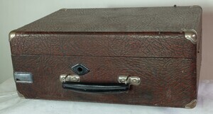 Tragbares Grammophon der Fa. OsRo mit Feder/Kurbelantrieb. Das Gerät läuft ausschließlich mit 78UpM, kann jedoch minimal, stufenlos angepasst/verändert werden. Beigepackt ist ein kleiner Behälter mit Reservenadeln. Der hölzerne Koffer ist mit braunem, grobnarbigen Leder(?) bezogen. Zum Schutz der Ecken sind diese mit Metallkappen gesichert