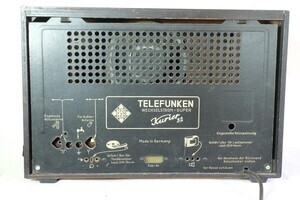 In den Jahren 1951/1952 hat Telefunken dieses klassische Tischmodell "Kurier 52" gebaut. Eine Besonderheit ist der Drehknopf auf der rechten Seitenwand, mit dem die Wellenbereiche UKW/KW/MW/LW und der Plattenspieler angesteuert werden. Die beiden Drehköpfe auf der Vorderseite stehen für Ein/Aus, Laut und Leise (links) und die Sendereinstellung (rechts) Auf der Rückseite sind Anschlüsse für einen Plattenspieler, ext. Lautsprecher sowie eine Antenne & Erdung vorgesehen.