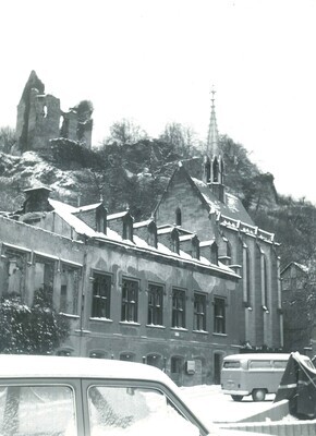 Schlossruine Sayn und sanierter Turm, 1975