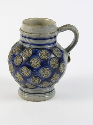 Ein kugeliger Krug auf einem hohen Fuß. Der Krug hat einen hohen, nach oben etwas verengten Hals und einen großen, ohrförmigen, gebogenen Henkel. Der Fuß ist am unteren Rand mit einem Ring aus kleinen Kreisen und darüber mit zwei blauen Bändern verziert. Der kugelige Bauch des Kruges ist mit eingeritzten Tieren dekoriert. In einem Kreis stehen sich zwei Pferde gegenüber, direkt darüber in dem Kreis ein Taubenpaar in gleicher Position. Über dem Taubenpaar, außerhalb des Kreises zwei weitere, sich gegenüberstehende Pferde. Unterhalb des mittigen Kreises ein Elefant. Auf den Seiten je ein Schwan und ein Hirsch. Auf dem Hals des Kruges, von einem Kreis umschlossen, die Jahreszahl "1680". Der Grund des Bauches und des Halses ist mit kleinen, blau bemalten Hufeisenformen gefüllt. Um den Henkel ist eine nach unten bogig abgeschlossene Partie freigelassen, zentral ist eine blaugemalte Blüte aufgebracht. Auf dem Henkel ist ein Blattstängel. Ein Band aus Dreiecken umgibt den Halsrand.