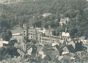 Schwarzweißfotografie. Diese Aufnahme entstand im Jahr 1962 im Rahmen eines Fotowettbewerbes (Fotograf: E.W. Euler, Bendorf) und zeigt eine Aufnahme der Schlossruine Sayn von der gegenüberliegenden Anhöhe im Brexbachtal. Am rechten Bildrand sind die Ruinen der Burgmannenhäuser der Familien von Stein und Reiffenberg zu erkennen. Am Fuße des Sayner Burgberges erbauten die Herren von Reiffenberg, Ministerialen der Sayner Grafen, im 14. Jahrhundert ein mittelalterliches Burghaus. Im Jahr 1753 fiel es durch Heirat an die Freiherren Boos von Waldeck, die es zu einem barocken Herrenhaus umbauten. Anfang des 19. Jahrhunderts wurde der Besitz durch Erwerb der unmittelbar benachbarten Güter und Weinberge des Reichsfreiherren vom und zum Stein vergrößert. Als Fürst Ludwig zu Sayn-Wittgenstein-Sayn mit seiner Ehefrau, Fürstin Leonilla, 1848 aus Russland wieder in die alte Heimat der Familie zurückkehrte, kaufte er das Anwesen mit den gesamten zugehörigen Liegenschaften von dem damaligen Koblenzer Landrat Graf Clemens Boos von Waldeck. Das barocke Herrenhaus, dessen Kern das spätmittelalterliche Burghaus bildete, ließ das Fürstenpaar zum Schloss umbauen. Mit dem Umbau wurde der Architekt Girard (1806-1872), der spätere Generalintendant des Louvre, betraut. Girard wählte, dem Zeitgeist und den Wünschen seiner Auftraggeber entsprechend, den neugotischen Stil. Es gelang ihm, ein einheitliches und harmonisches Werk zu schaffen, das die hohen Erwartungen der Zeitgenossen übertraf. Eine Besonderheit war die Ver­wen­dung von Architektur­elementen aus Eisen, die in der benachbarten Sayner Hütte kunstvoll gegossen wurden. Das Schloss wurde 1945, kurz vor Kriegsende, erheblich beschädigt und verfiel. Mit wieder erwachender Wertschätzung der Neugotik erklärte man Schloss Sayn zu einem Baudenkmal von nationaler Bedeutung. Von 1995 bis 2000 wurde ein vom Land Rheinland-Pfalz gefördertes Revitialisierungs- und Restaurationsprogramm durchgeführt. Fürst Alexander und Fürstin Gabriela zu Sayn-Wittgenstein Sayn präsentieren seit Mai 2000 Schloss Sayn wieder der Öffentlichkeit mit Tagungs- und Veranstaltungsräumen, Schlossrestaurant und Museum.