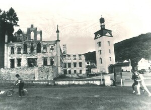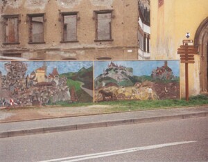 Farbfotografie. Diese Aufnahme zeigt die Ruine von Schloss Sayn und den Turm der früheren Stadtbefestigung (umgangssprachlich Schlossturm genannt). Die Baustelle ist durch einen Bauzaun gesichert. Die Spanplatten des Zauns wurden durch Schüler der Don Bosco Hauptschule in Sayn kunstvoll bemalt (1979/1980er Jahre). Am Fuße des Sayner Burgberges erbauten die Herren von Reiffenberg, Ministerialen der Sayner Grafen, im 14. Jahrhundert ein mittelalterliches Burghaus. Im Jahr 1753 fiel es durch Heirat an die Freiherren Boos von Waldeck, die es zu einem barocken Herrenhaus umbauten. Anfang des 19. Jahrhunderts wurde der Besitz durch Erwerb der unmittelbar benachbarten Güter und Weinberge des Reichsfreiherren vom und zum Stein vergrößert. Als Fürst Ludwig zu Sayn-Wittgenstein-Sayn mit seiner Ehefrau, Fürstin Leonilla, 1848 aus Russland wieder in die alte Heimat der Familie zurückkehrte, kaufte er das Anwesen mit den gesamten zugehörigen Liegenschaften von dem damaligen Koblenzer Landrat Graf Clemens Boos von Waldeck. Das barocke Herrenhaus, dessen Kern das spätmittelalterliche Burghaus bildete, ließ das Fürstenpaar zum Schloss umbauen. Mit dem Umbau wurde der Architekt Girard (1806-1872), der spätere Generalintendant des Louvre, betraut. Girard wählte, dem Zeitgeist und den Wünschen seiner Auftraggeber entsprechend, den neugotischen Stil. Es gelang ihm, ein einheitliches und harmonisches Werk zu schaffen, das die hohen Erwartungen der Zeitgenossen übertraf. Eine Besonderheit war die Verwendung von Architekturelementen aus Eisen, die in der benachbarten Sayner Hütte kunstvoll gegossen wurden. Das Schloss wurde 1945, kurz vor Kriegsende, erheblich beschädigt und verfiel. Mit wieder erwachender Wertschätzung der Neugotik erklärte man Schloss Sayn zu einem Baudenkmal von nationaler Bedeutung. Von 1995 bis 2000 wurde ein vom Land Rheinland-Pfalz gefördertes Revitialisierungs- und Restaurationsprogramm durchgeführt. Fürst Alexander und Fürstin Gabriela zu Sayn-Wittgenstein Sayn präsentieren seit Mai 2000 Schloss Sayn wieder der Öffentlichkeit mit Tagungs- und Veranstaltungsräumen, Schlossrestaurant und Museum.