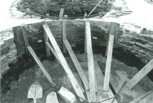 Farbfotografie. Diese Aufnahme zeigt einen Blick auf die Rostschachtöfen der Grube Werner, auf der Vierwindenhöhe in Bendorf zu Beginn der Restaurierungsarbeiten im Jahr 1992. Im April des Jahres 1724 erhielten der Bendorfer Hüttenmeister Wilhelm Remy, der Kammerverwalter Wirtzen zu Hachenburg und der Kanzleidirektor Grün vom damaligen Landesherren von Bendorf, dem Fürsten von Sachsen-Eisenach, die Genehmigung in der Gemarkung Bendorf Eisenstein zu brechen. Der Bendorfer Eisengrubenbetrieb lag mit seiner Hauptwerkanlage auf der Vierwindenhöhe und trug die Bezeichnung "Grube Werner", weitere Stollen befanden sich auf der Loh, im Wenigerbach- und im Brexbachtal sowie auf dem Eisenberg. Aus diesen Stollen wurde fast 200 Jahre lang Erz gefördert. Um das Jahr 1890 waren insgesamt rund 250 Bergleute beschäftigt. Die Erzgrube Werner wurde im Jahr 1915 geschlossen und war zuletzt im Besitz der Firma Krupp in Essen. Alfred Krupp hatte sie 1870 von der Firma Remy, Hoffmann & Co. erworben. Die Eisenerz-Röstöfen der ehemaligen Grube Werner sind in der Form die einzig erhalten gebliebenen Zeugen einer vergangenen Bergbau-Epoche in Deutschland. Im Jahr 1983 unter Denkmalschutz gestellt und von 1990 bis 1998 komplett restauriert und saniert, präsentieren sie sich heute mit der integrierten Freilichtbühne als kulturhistorische Attraktion.