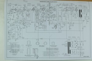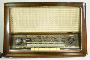 Saba baute dieses große, klassische Tischgerät in den Jahren 1957-1959. Die 4 eingebauten Lautsprecher (2 + 2) verliehen dem Gerät eine beachtliche Klangfülle. Über 8 Drucktasten lassen sich (Ein/Aus, TB/Phono, alle Wellenbereiche sowie eine Klangverbesserung für Sprache und Musik steuern. Desweiteren verfügt das Gerät über 2 große Drehschalter für Laut/Leise, Balanceregler, Sendereinstellung und Ausrichten der eingebauten Peilantenne. Rückseitig sind die Anschlüsse für Plattenspieler, Tonband (Ein/Ausgang) Zweit Lautsprecher, Antenne und Erdung. Für rund 400 DM war das Radio damals zu haben. Bei unserem Gerät befindet sich der Original Schaltplan noch im Innern.