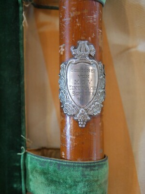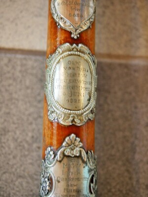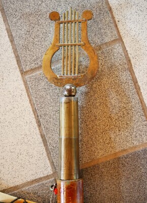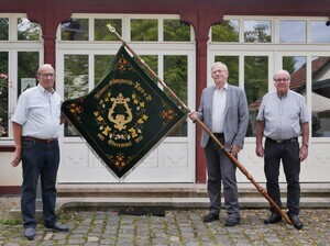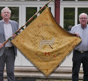 Beschreibung: Vereinsfahne aus Samt mit zweiteiligem Stock aus Holz mit Messingverbindung. Vorderseite bestickter Samt, Rückseite bestickte Seide. Auf grünem Samt (Vorderseite) und weißem Leinen (Rückseite) sind mit farbigem Garn Schriften und Ornamete gestickt. Erklärungsbedürftig ist die Rückseiten dieser Fahne: Neben Dirigierstock, Notenblatte und Lorbeerkranz findet sich der Spruch "Im Liede stark, Deutsch bis ins Mark". Die Fahne stammt von 1926, also aus der Zeit der Weimarer Republik. Konz war wie das ganze Rheinland nach dem Ersten Weltkrieg offiziell von den Alliierten de facto aber französisch besetzt. Und dieser Spruch war wohl einfach ein sehr deutliches Statement deutsch bleiben zu wollen. Geschichte: Der Männergesangverein "Lyra" Oberemmel gegründet im Jahr 1913 musste nach 105 Jahren erfolgreicher Chorarbeit seine Tätigkeit im Kalenderjahr 2018 aufgrund von Nachwuchsmangel einstellen. In der Chronik des Vereins ist beschrieben, dass die Fahnenweihe am 6. Juni 1926 als ein Höhepunkt der damaligen Vereinsgeschichte im Rahmen eines großen Sängerfestes gefeiert wurde. In den Wirren des zweiten Weltkriegs wurde die Fahne 1945 von amerikanische Soldaten als Souvenir nach Süddeutschland mitgenommen. Von dort fand sie nach dem Krieg, leicht beschädigt, den Weg wieder zurück nach Oberemmel, wo sie weiterhin bei freudigen und traurigen Ereignissen zum Einsatz kam. Am 14. August 2019 wurde sie zusammen mit der Zelterplakette, die der Männerchor für seine 100-jährigeb Verdiensten im Sinne des Chorgesangs erhahlten hatte, übergeben.