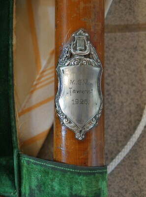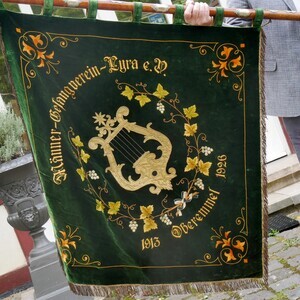 Beschreibung: Vereinsfahne aus Samt mit zweiteiligem Stock aus Holz mit Messingverbindung. Vorderseite bestickter Samt, Rückseite bestickte Seide. Auf grünem Samt (Vorderseite) und weißem Leinen (Rückseite) sind mit farbigem Garn Schriften und Ornamete gestickt. Erklärungsbedürftig ist die Rückseiten dieser Fahne: Neben Dirigierstock, Notenblatte und Lorbeerkranz findet sich der Spruch "Im Liede stark, Deutsch bis ins Mark". Die Fahne stammt von 1926, also aus der Zeit der Weimarer Republik. Konz war wie das ganze Rheinland nach dem Ersten Weltkrieg offiziell von den Alliierten de facto aber französisch besetzt. Und dieser Spruch war wohl einfach ein sehr deutliches Statement deutsch bleiben zu wollen. Geschichte: Der Männergesangverein "Lyra" Oberemmel gegründet im Jahr 1913 musste nach 105 Jahren erfolgreicher Chorarbeit seine Tätigkeit im Kalenderjahr 2018 aufgrund von Nachwuchsmangel einstellen. In der Chronik des Vereins ist beschrieben, dass die Fahnenweihe am 6. Juni 1926 als ein Höhepunkt der damaligen Vereinsgeschichte im Rahmen eines großen Sängerfestes gefeiert wurde. In den Wirren des zweiten Weltkriegs wurde die Fahne 1945 von amerikanische Soldaten als Souvenir nach Süddeutschland mitgenommen. Von dort fand sie nach dem Krieg, leicht beschädigt, den Weg wieder zurück nach Oberemmel, wo sie weiterhin bei freudigen und traurigen Ereignissen zum Einsatz kam. Am 14. August 2019 wurde sie zusammen mit der Zelterplakette, die der Männerchor für seine 100-jährigeb Verdiensten im Sinne des Chorgesangs erhahlten hatte, übergeben.