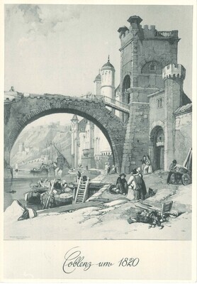 Lithographie als Postkarte gedruckt und mit der Aufschrift "Coblenz um 1820" am unteren Bildrand versehen. Dieses Bild zeigt eine Ansicht von Koblenz um das Jahr 1820. Im Hintergrund erkennbar sind die Festung Ehrenbreitstein und das Deutsche Eck, der Zusammenfluss von Rhein und Mosel. Im Vordergrund sind die Moselbrücke mit Turm der Stadtbefestigung dargestellt.