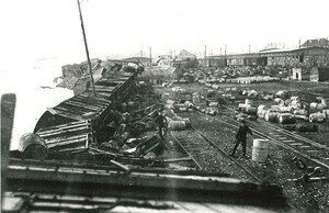Schwarzweißfotografie. Diese Aufnahme entstand im Januar 1920 und zeigt die Verwüstung im amerikanischen Militärdepot nach dem Hochwasser im Bendorfer Hafen 1919/1920. Auf diesem Bild sind Benzinfässer und umgestürzte Eisenbahnwagons zu erkennen.