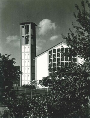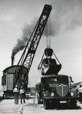 Schwarzweißfotografie. Diese Aufnahme entstand im Jahr 1938 und zeigt einen Verladevorgang mit dem Dampfkran im Bendorfer Rheinhafen. Dieser Kran stürzte im Jahr 1970 während eines Unwetters in den Rhein.