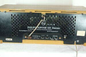Das Philips Radio "Jupiter 541 Stereo" mit der Typenbezeichnung "B5D41A" ist ein Tischgerät mit normaler Breite aber nur knapp 25 cm Höhe. Philips baute dies Gerät von 1964 - 1967. Bedient wird das Stereo Radio über 10 Drucktasten, 2 große, Drehregler sowie 2 kleine senkrecht stehende Drehregler mit denen Höhe und Tiefe gesteuert werden. Rückseitig verfügt das Radio über je einen Tonband /Plattenspieler und Antennenanschluss. Eingebaut wurden auch Anschlüsse für externe Sereo Lautsprecher. Die beiden verbauten Lautsprecher mit gut 20 cm Durchmesser sorgen für einen ausreichend, guten Klang.