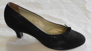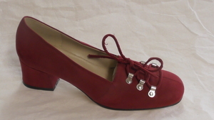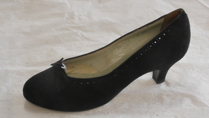 Ein einzelner Damenstiefel aus buntem Veloursleder. Eckige Form, mit Veloursleder bezogener Absatz (ca. 5cm), Reißverschluss an der Innenseite. Die Laufsohle fehlt. Der Schuh hat keine Herstellermarkierung. Datiert auf 1970.
