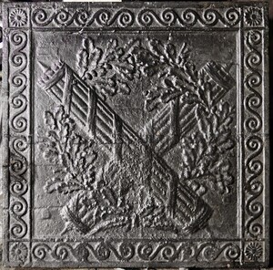 Takenplatte mit der Darstellung von 2 gekreuzten Liktorenbündeln (?). Es fehlen jedoch die Schwerter. Die Rutenbündel sind von einem Kranz Eichenlaub umgeben.