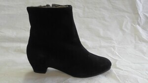 Der rechte Schuh eines Paares Damenstiefel aus beigem Veloursleder. Spitze Form, mit Veloursleder bezogener Absatz (ca. 4cm), Reißverschluss an der Innenseite. Die Sohle des Schuhs stammt von der Firma Continental der Schuh selbst wurde hergestellt von der Firma Jubo in Hauenstein (D). Datiert auf 1963. Dieser Schuh und 2549-2018 bilden ein Paar.