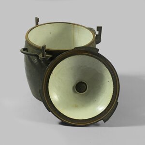 Dieser Dampfdrucktopf (Schnellkochtopf) aus Gusseisern wird durch Zuschrauben des Deckels in die Keilaretierung auf dem Unterteil befestigt. An der Oberseite des Deckels ist ein Ventil zum Ablassen von Dampf und Druck angebracht. Der Innenraum ist am Topf und Deckel weiß emailliert. Auf dem Deckel und dem Gehäuse ist das Herstellerzeichen der Eisenwerke Lauchhammer, vormals Gräflich Einsiedel`sche Werke, (ein Sechseckrahmen Krone, darunter zwei sich kreuzende Eisen und Schlegel und die zwei Buchstaben L und H erhaben zu sehen. Hergestellt wurde der Topf zwischen 1872 bis 1922, denn in dieser Zeit wurde das Zeichen in Sechseckrahmen verwendet.